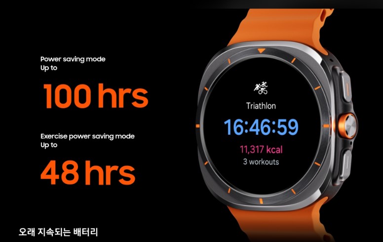 갤럭시 워치7 울트라는 590mAh 대용량 배터리를 탑재해 하루 이상, 길게는 최대 100시간까지 사용 가능합니다.