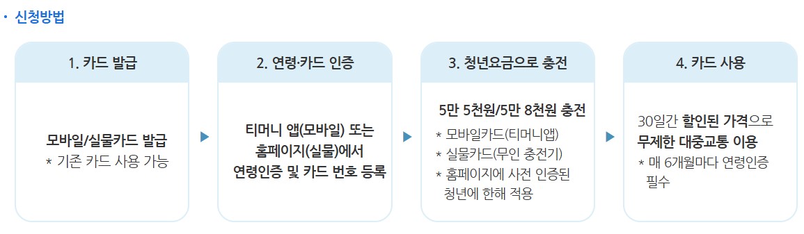 - 모바일 티머니 앱 또는 실물 카드 발급 후 티머니 홈페이지 등록