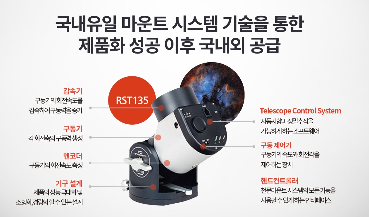 - 천문 마운트 시스템: 정밀한 천체 관측을 위한 마운트 시스템을 개발하여, 국내외 천문대에 공급하고 있습니다.