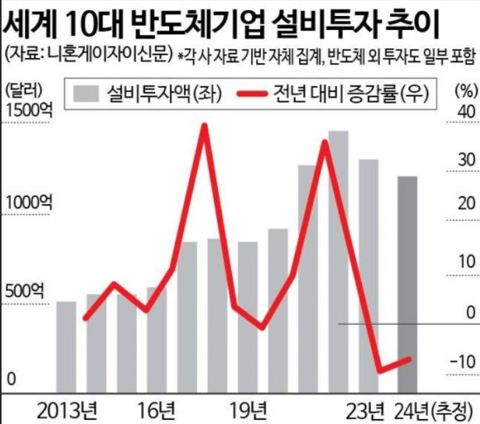 설비투자: 2023년 한 해 동안 글로벌 반도체 설비투자가 크게 줄었으나, 2024년 하반기부터 TSMC, 삼성전자, 인텔 등이 설비 확대 발표