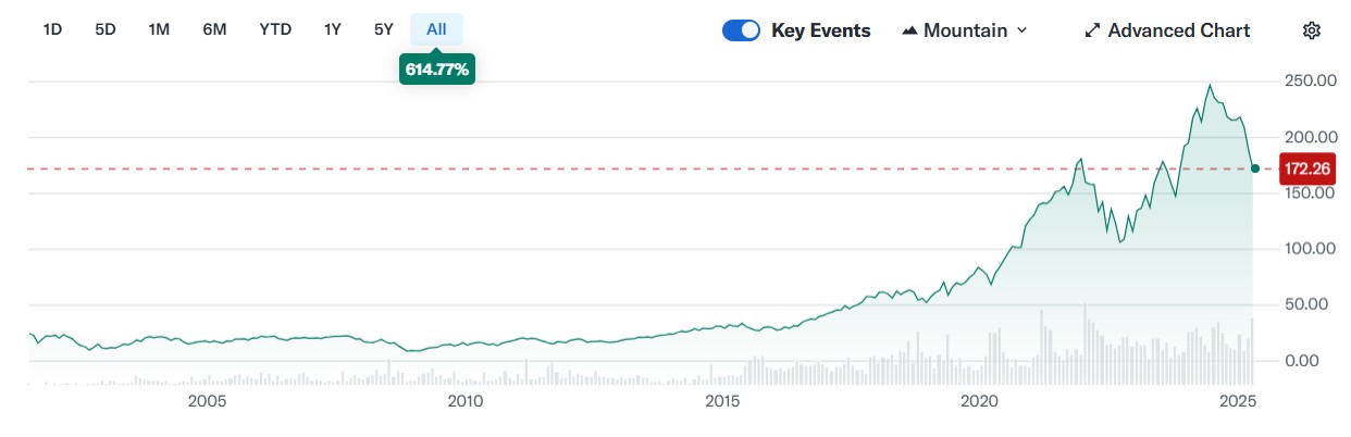 - 주가 흐름: 2015년 이후 꾸준한 상승세를 보였으며, 특히 2019년부터 AI 및 데이터센터 수요 증가로 급등하였습니다.