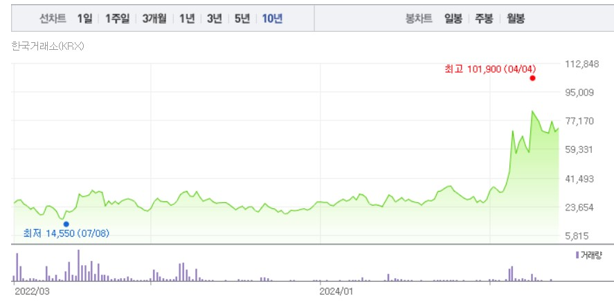 ☞ 주가 저점은 2022년 7월 8일의 14,550원, 고점은 2024년 4월 4일의 101,900원으로, 약 7배에 달하는 상승폭을 기록했습니다.