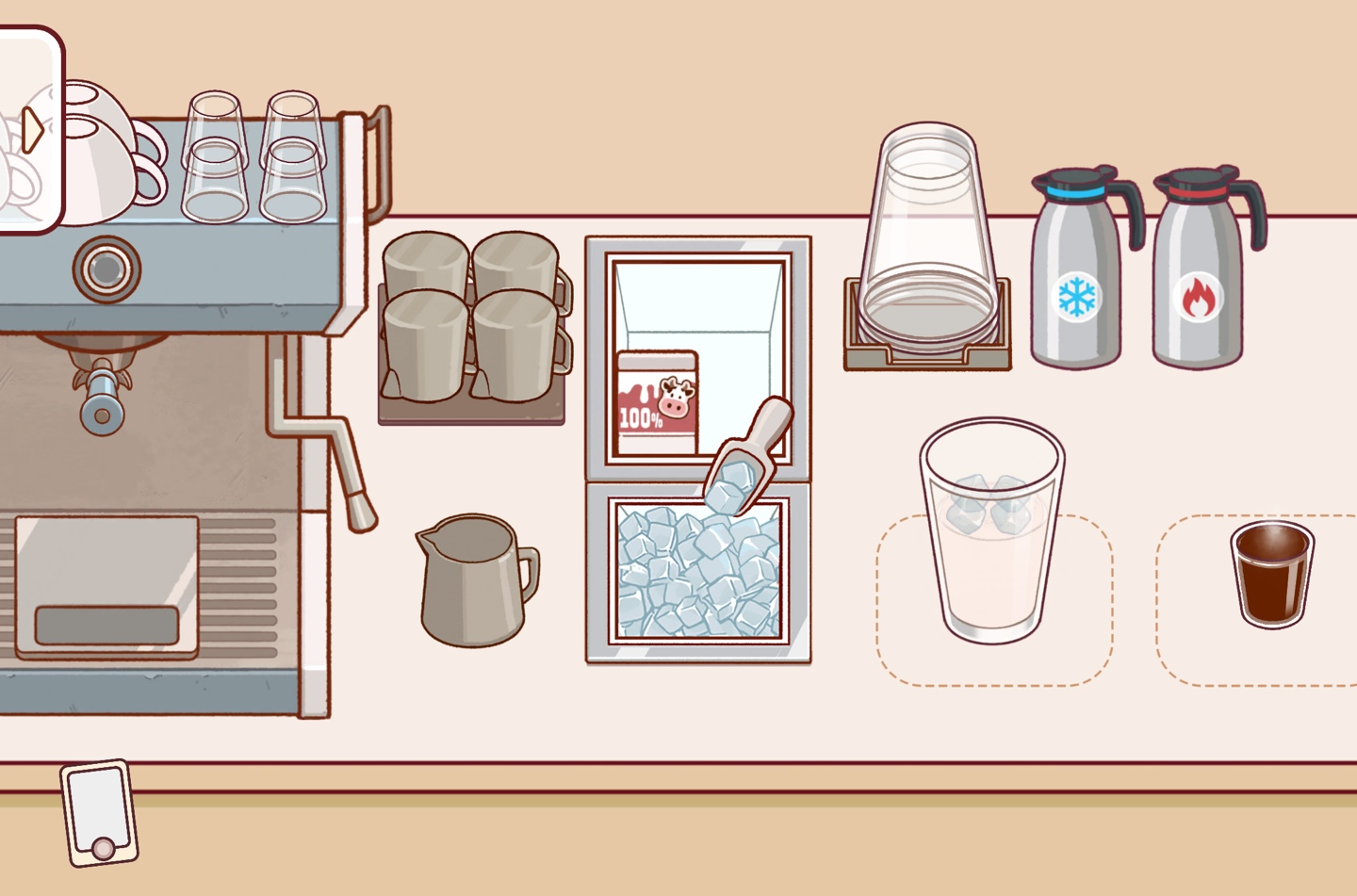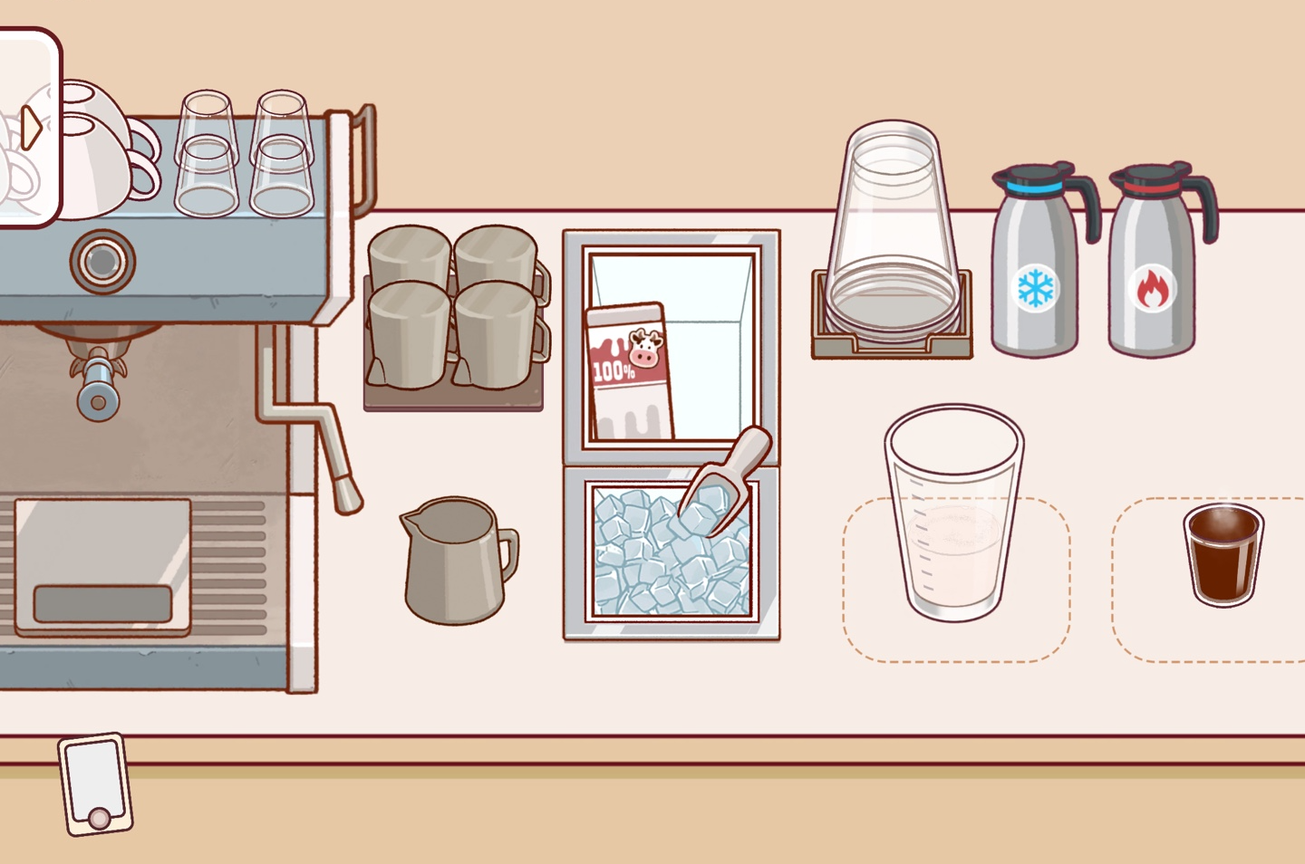 - 도구에서 계량컵을 구입하고 활성화하면 우유의 분량을 5눈금으로 정확하게 계량하여 따를 수 있습니다.