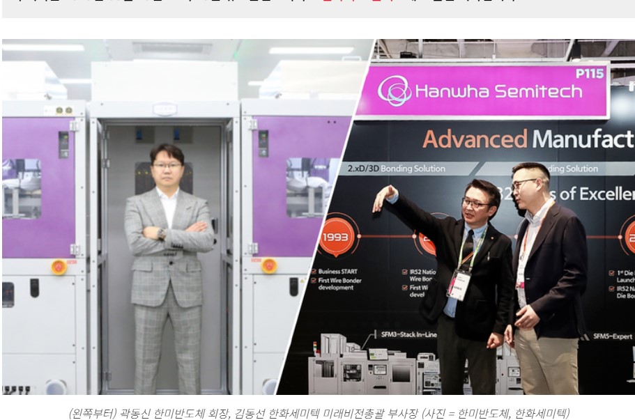한화세미텍은 HBM 시장 진입이 비교적 늦었지만, 한화정밀기계의 SMT(표면실장기술) 노하우와 로봇 제어 기반 정밀 장비 기술을 활용해 자체 개발한 TC 본더를 상용화하며 빠르게 추격하고 있습니다.