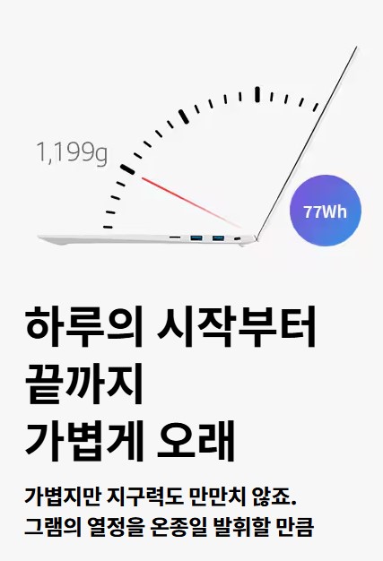 LG그램은 1.3kg 이하의 가벼운 무게(500ml 생수 2병보다 가볍고, 일반 서류 파일 2권 정도의 무게에 해당됨)와 최대 25시간 지속 가능한 배터리 수명을 자랑하며, 여전히 '그램은 가볍다'는 브랜드 이미지를 유지하고 있습니다. 특히 책상에서 장시간 앉아 일하거나, 노트북을 들고 회의실을 자주 오가는 재택근무자에게 최적화된 설계가 돋보입니다.